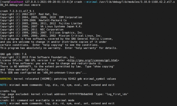 명령어가 실행이 되지 않아 찾아보니 옵션 --minimal을 추가하여 crash 프롬프트를 띄우는데 성공했으나 명령어를 사용하는데 많은 제약이 있었습니다.